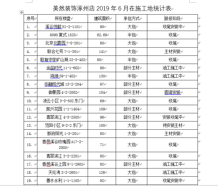 美然裝飾7月份在施項目數量達到80個,其中涿州在施項目共54個,高碑店23個,北京3個。 涿州52個家裝項目,2個工裝項目。 涿州52個家裝項目中:高鐵新城和香邑溪谷項目占據較大比重,其中理想灣4個,獅子城4個,牛津花園1個,華融現代城1個。香邑溪谷7個。另外天倫灣2個,翡翠濱江4個。 工裝項目中,涿州中餐館300平米左右,紅葉生活館200平米左右,美然裝飾負責設計和施工。 北京項目一個位于良鄉,兩個位于西城區,另外目前朝陽區一戶也已經進場施工,美然裝飾在北京同樣體現出了設計、質量、價格全方位的優勢,隨著業務的推進,北京的業務將呈現全面開花的趨勢。 高碑店的23個項目分布于15個小區,其中玫瑰園3戶,英倫名郡2戶,鉑悅山3戶,萬和城2戶,幸福城2戶,松林店自建別墅及林語城別墅各1戶。