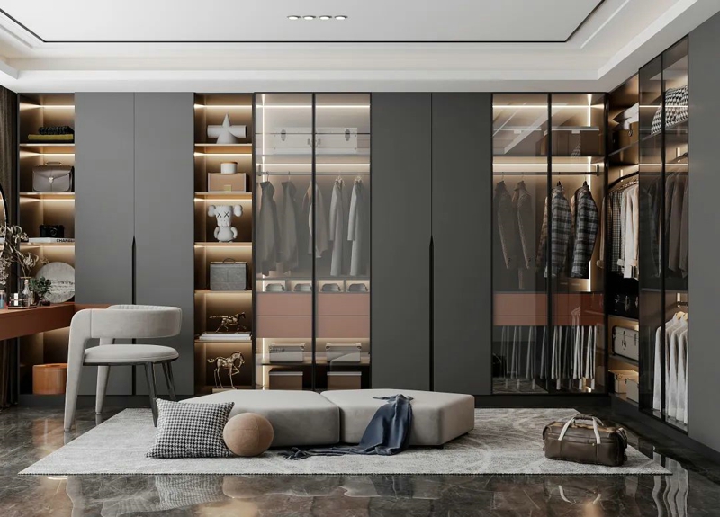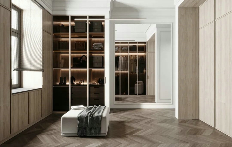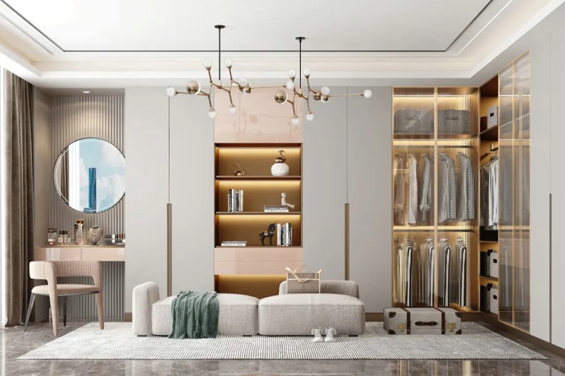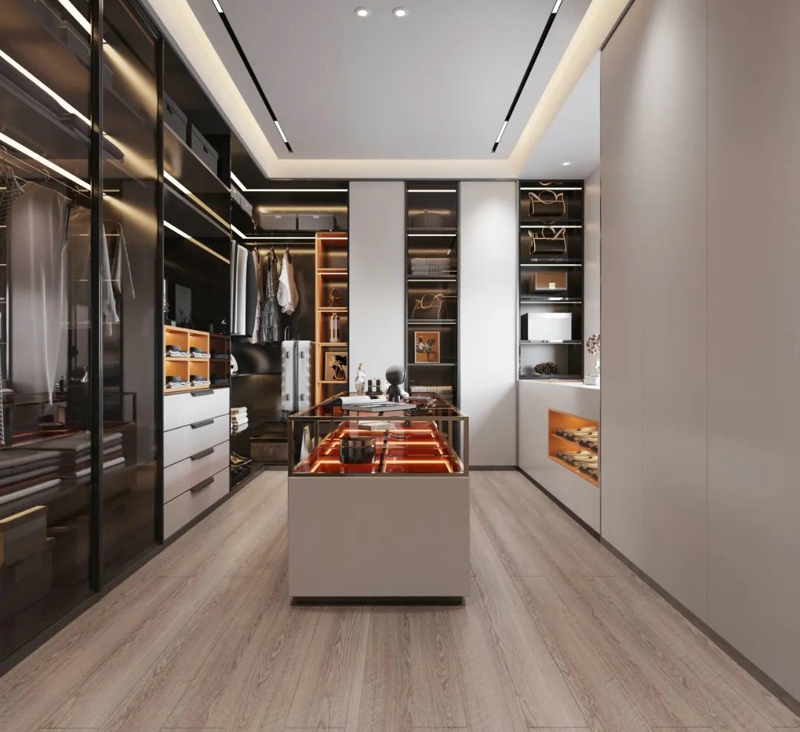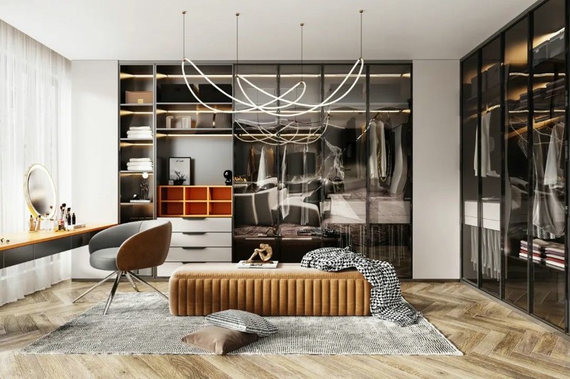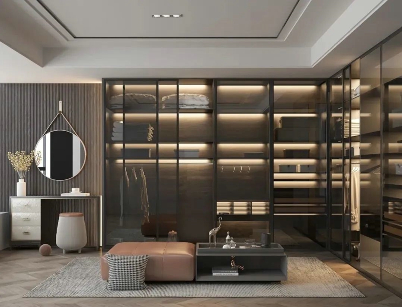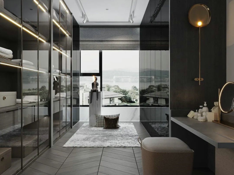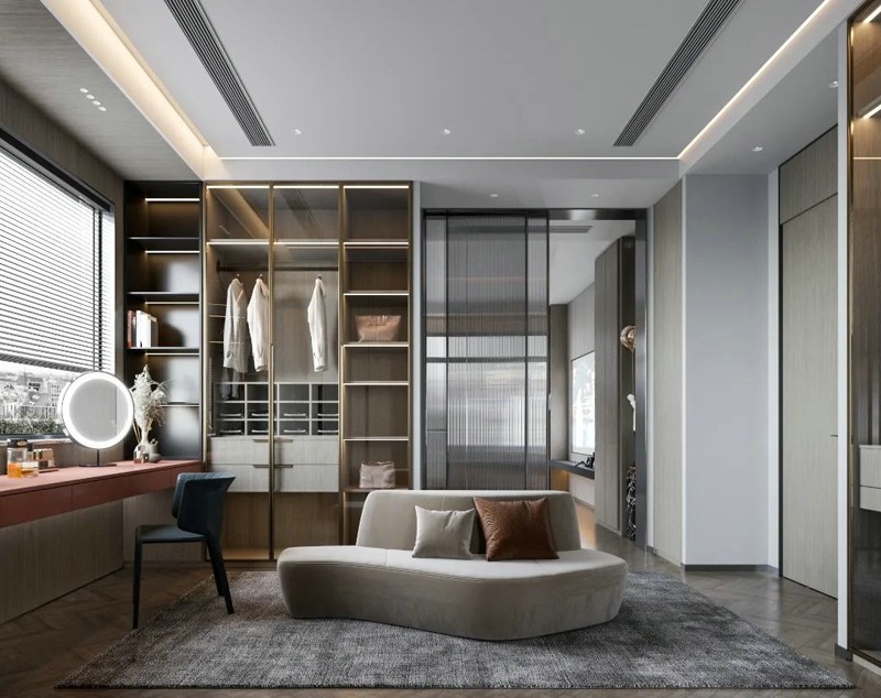 通頂的玻璃衣柜,一氣呵成,拉伸了空間的縱深感,在線性燈光的加持下,摩登質感悄然迸發。