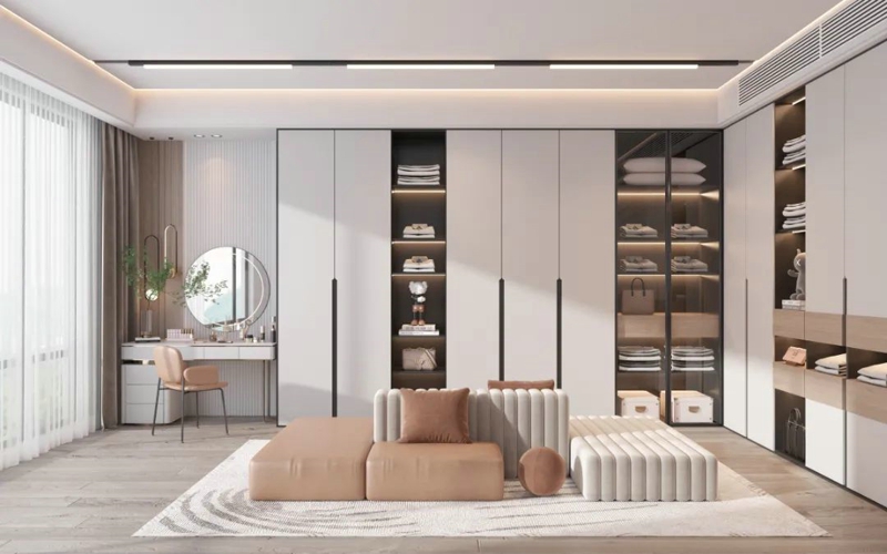 擁有足夠收納,可懸掛的衣架與儲物柜結合,燈帶的設計,每一個格子都有它專屬的物品擺放。